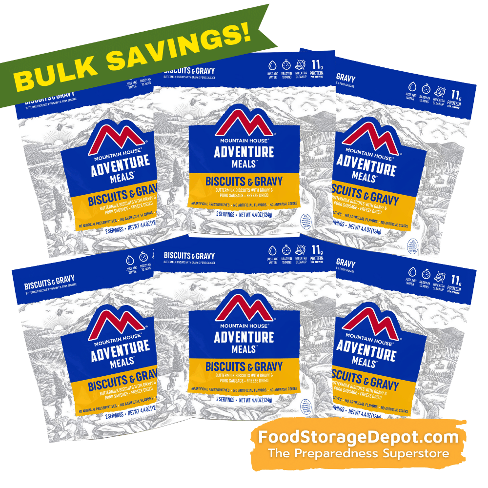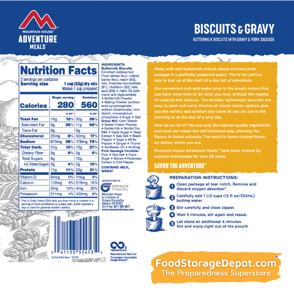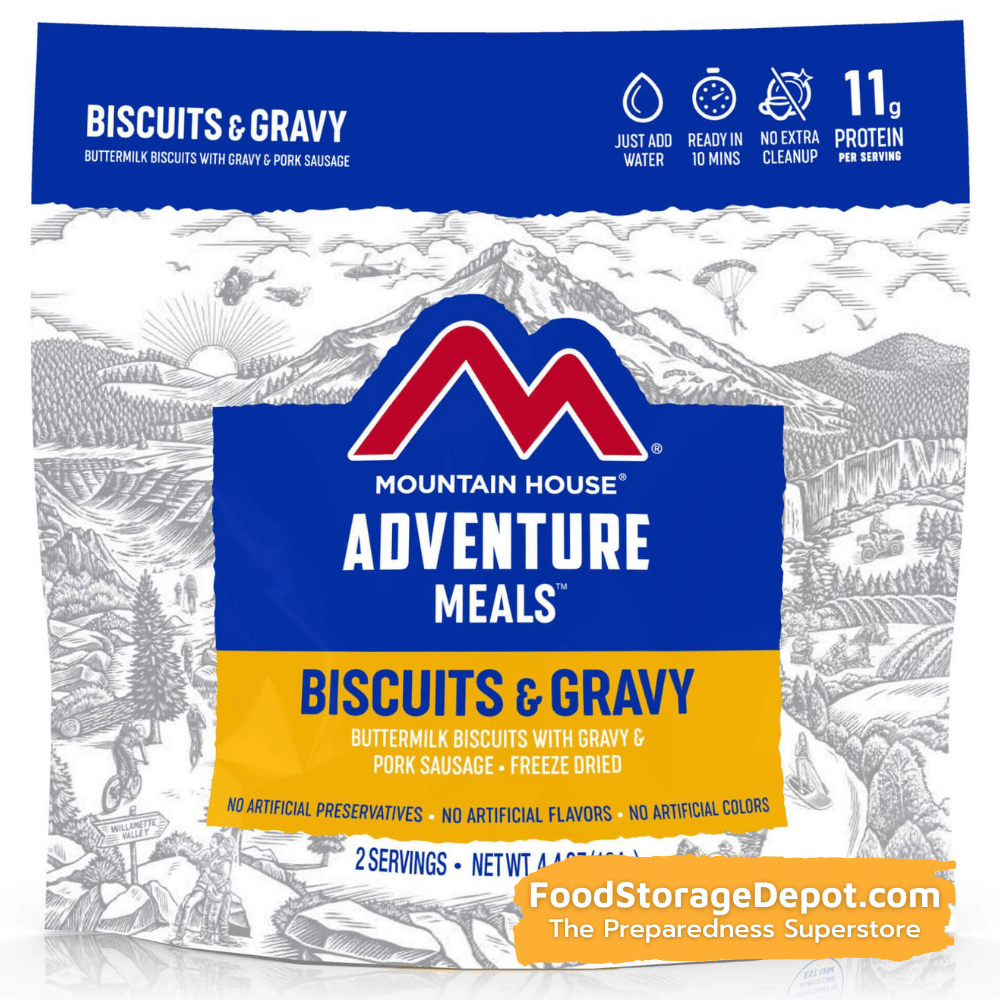 Each pouch of Biscuits and Gravy contains 2 total servings of comforting, delicious food, perfect for emergency food storage, survival, camping trips, RV expeditions, and so much more.