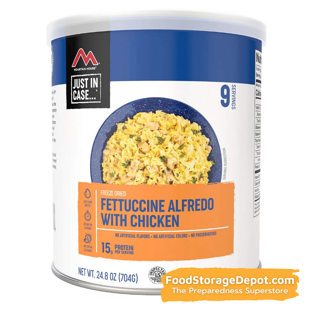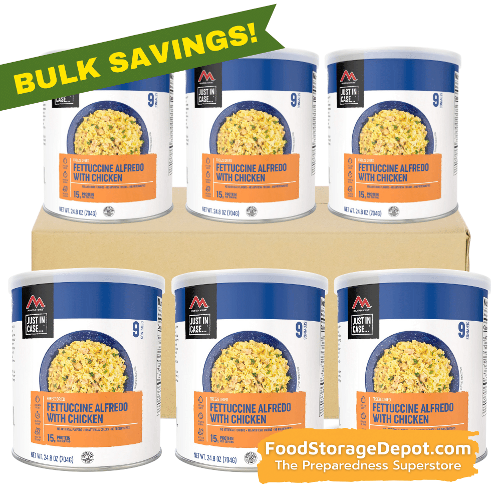 Each can of Fettuccine Alfredo with Chicken contains 9 total servings of comforting, delicious food, perfect for emergency food storage, survival, camping trips, RV expeditions, and so much more.
